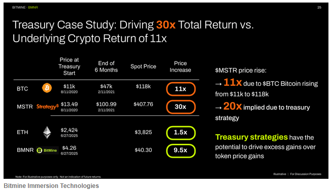 Strategy起步时股价13.49美元,比特币价格11000美元;到2025年6月底,比特币上涨11倍至118000美元,Strategy股价暴涨30倍至407.76美元。Bitmine在6月底前涨幅达9.5倍,同期以太坊仅上涨1.5倍,当前储备策略可能使Bitmine股价未来继续跑赢以太坊。