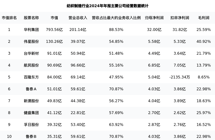 健盛集团最新报告期数据为年报,下表汇总了纺织制造行业内市值靠前的公司年报主要经营数据