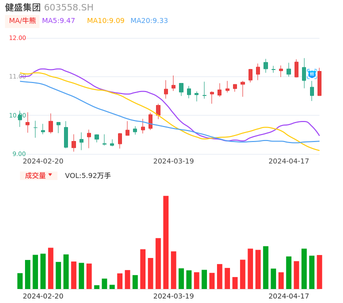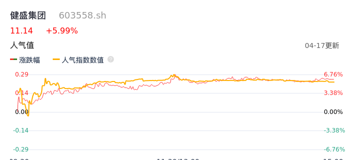 04月17日,健盛集团收报11.14,股价涨幅5.99%,成交金额6510.85万元,换手率1.60%。