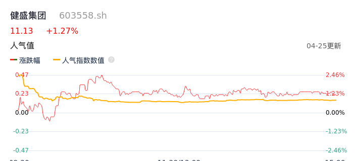 04月25日,健盛集团收报11.13,股价涨幅1.27%,成交金额4850.97万元,换手率1.18%。
