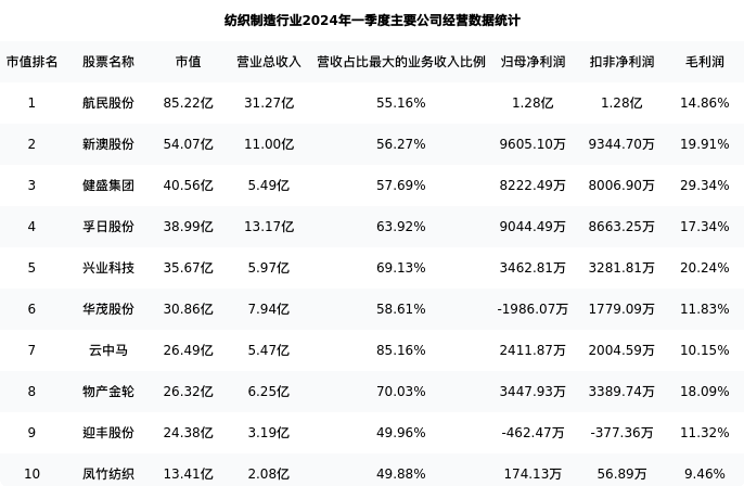 健盛集团最新报告期数据为一季度,下表汇总了纺织制造行业内市值靠前的公司一季度主要经营数据