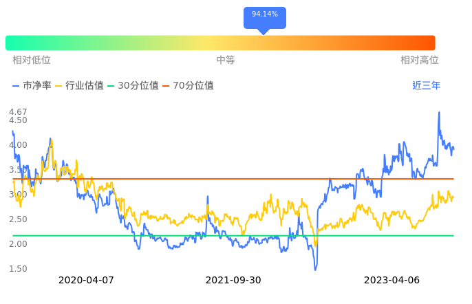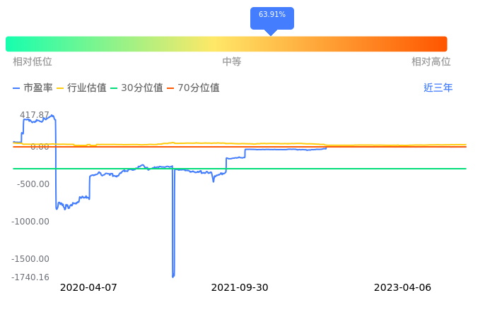 2023年04月06日,中通国脉下跌1.75%收于12.91,今日成交金额1.01亿元。下文将从市盈率PETTM、市净率PB、市现率3个角度去分析公司估值情况。