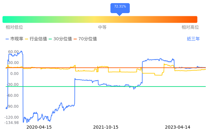 2023年04月14日,中通国脉上涨1.25%收于13.01,今日成交金额1.23亿元。下文将从市盈率PETTM、市净率PB、市现率3个角度去分析公司估值情况。