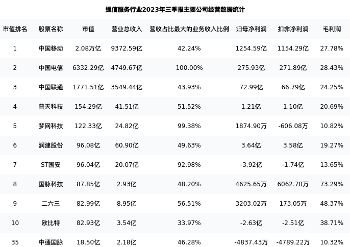 中通国脉最新报告期数据为三季报,下表汇总了通信服务行业内市值靠前的公司三季报主要经营数据