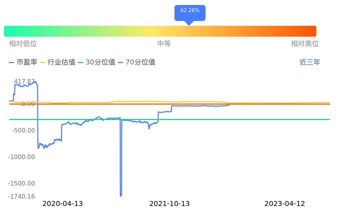 2023年04月12日,中通国脉上涨6.28%收于13.20,今日成交金额1.46亿元。下文将从市盈率PETTM、市净率PB、市现率3个角度去分析公司估值情况。