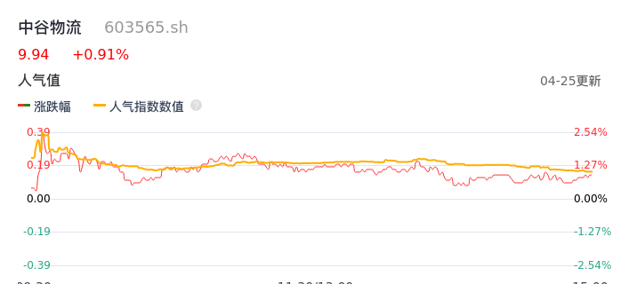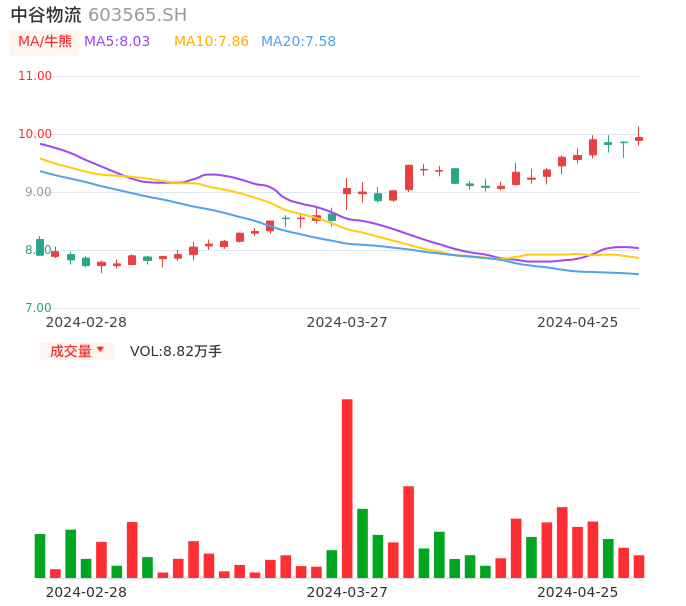 04月25日,中谷物流收报9.94,股价涨幅0.91%,成交金额8790.25万元,换手率0.42%。