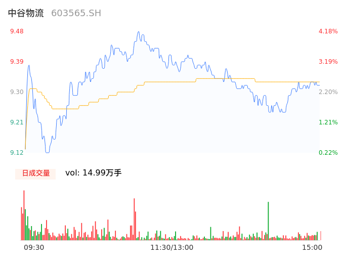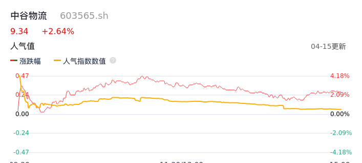 04月15日,中谷物流收报9.34,股价涨幅2.64%,成交金额1.40亿元,换手率0.71%。