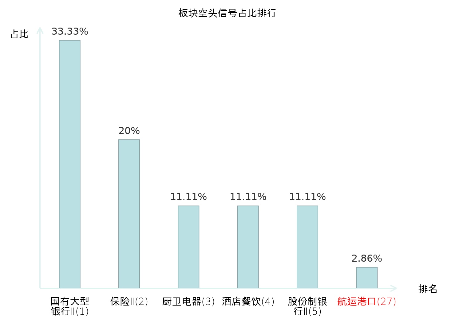 全市场所有行业板块中主力空头信号占比排名中,国有大型银行Ⅱ板块位居第一。铁路公路板块名次提升最快,较昨日上升114位。