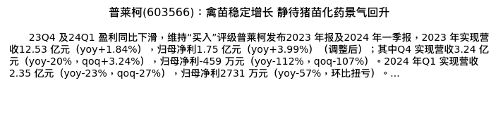 值得注意的是:2024年04月华泰证券的熊承慧分析师,首次发布关于普莱柯的研究报告,标题为:普莱柯(603566):禽苗稳定增长 静待猪苗化药景气回升。
