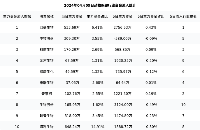 从主力资金流向来看,动物保健行业今日主力资金流入8294.98万元,在所有申万二级行业中排名:66/131。