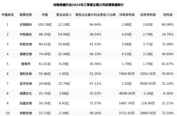 普莱柯最新报告期数据为三季度,下表汇总了动物保健行业内市值靠前的公司三季度主要经营数据