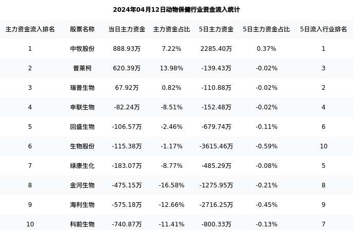 从主力资金流向来看,动物保健行业今日主力资金流入9591.42万元,在所有申万二级行业中排名:109/131。