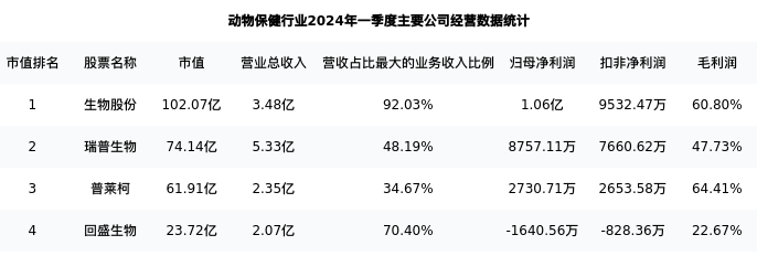 普莱柯最新报告期数据为一季度,下表汇总了动物保健行业内市值靠前的公司一季度主要经营数据