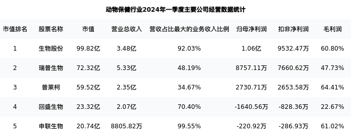 普莱柯最新报告期数据为一季度,下表汇总了动物保健行业内市值靠前的公司一季度主要经营数据