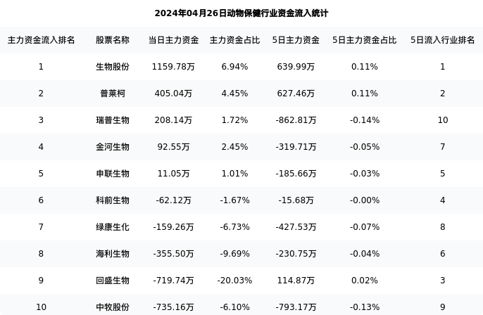 从主力资金流向来看,动物保健行业今日主力资金流入1.25亿元,在所有申万二级行业中排名:112/131。