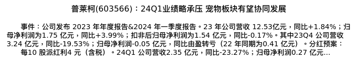 值得注意的是:2024年04月中国银河的谢芝优/陆思源分析师,首次发布关于普莱柯的研究报告,标题为:普莱柯(603566):24Q1业绩略承压 宠物板块有望协同发展。