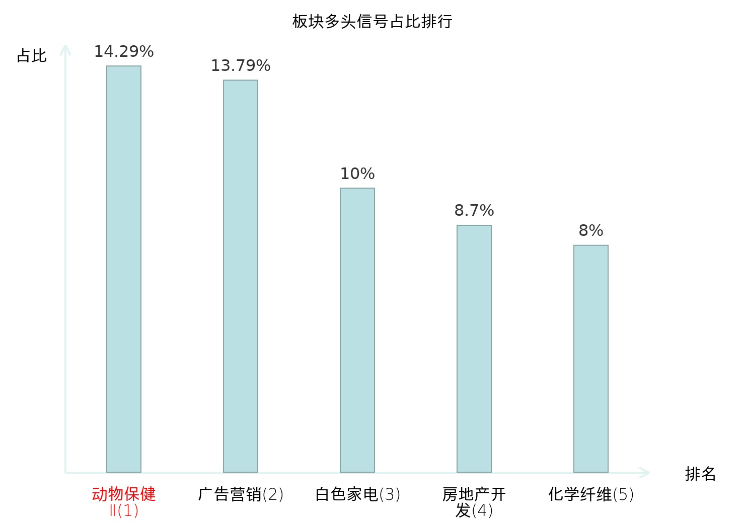 全市场所有行业板块中主力多头信号占比排名中,动物保健Ⅱ板块位居第一。动物保健Ⅱ板块名次提升最快,较昨日上升100位。