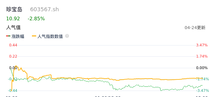 04月24日,珍宝岛收报10.92,股价涨幅-2.85%,成交金额8219.01万元,换手率0.80%。