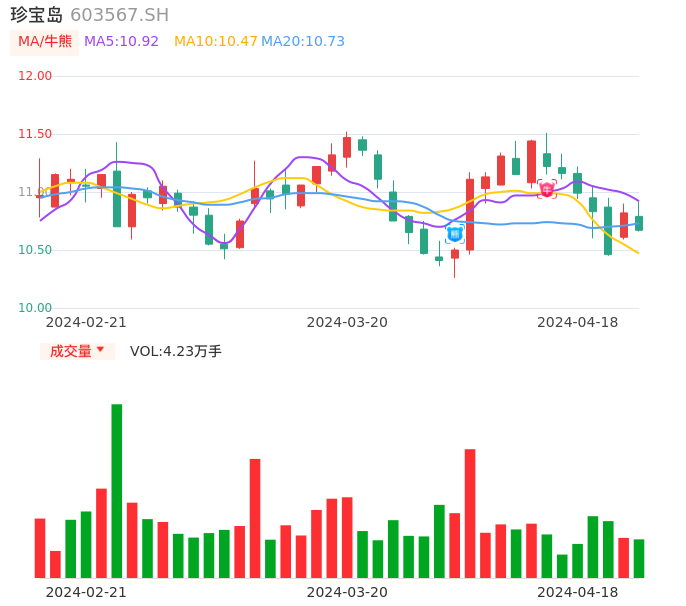04月18日,珍宝岛收报10.67,股价涨幅-1.39%,成交金额4554.58万元,换手率0.45%。
