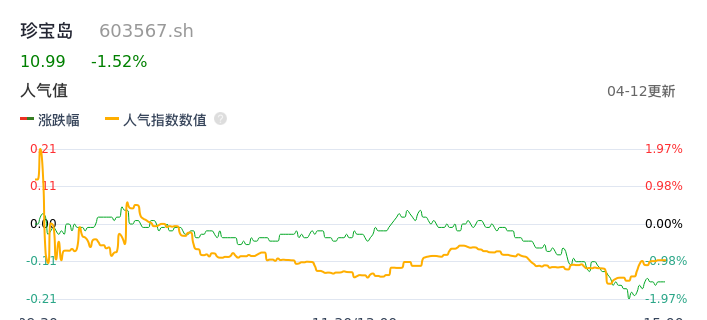04月12日,珍宝岛收报10.99,股价涨幅-1.52%,成交金额4401.42万元,换手率0.42%。