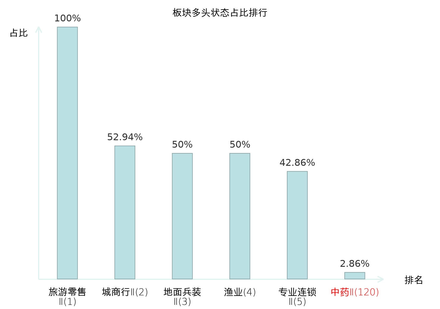 全市场所有行业板块中主力多头状态占比排名中,旅游零售Ⅱ板块位居第一。旅游及景区板块名次提升最快,较昨日上升69位。