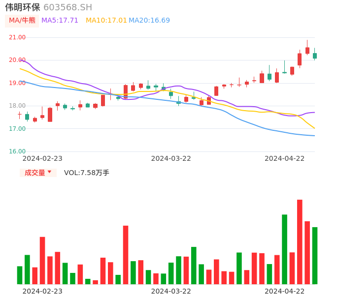 04月22日,伟明环保收报20.08,股价涨幅-2.29%,成交金额1.53亿元,换手率0.45%。