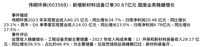 值得注意的是:2024年04月长江证券的王鹤涛/徐科/任楠/王筱茜/肖百桓分析师,首次发布关于伟明环保的研究报告,标题为:伟明环保(603568):新增新材料设备订单30.67亿元 固废业务稳健增长。