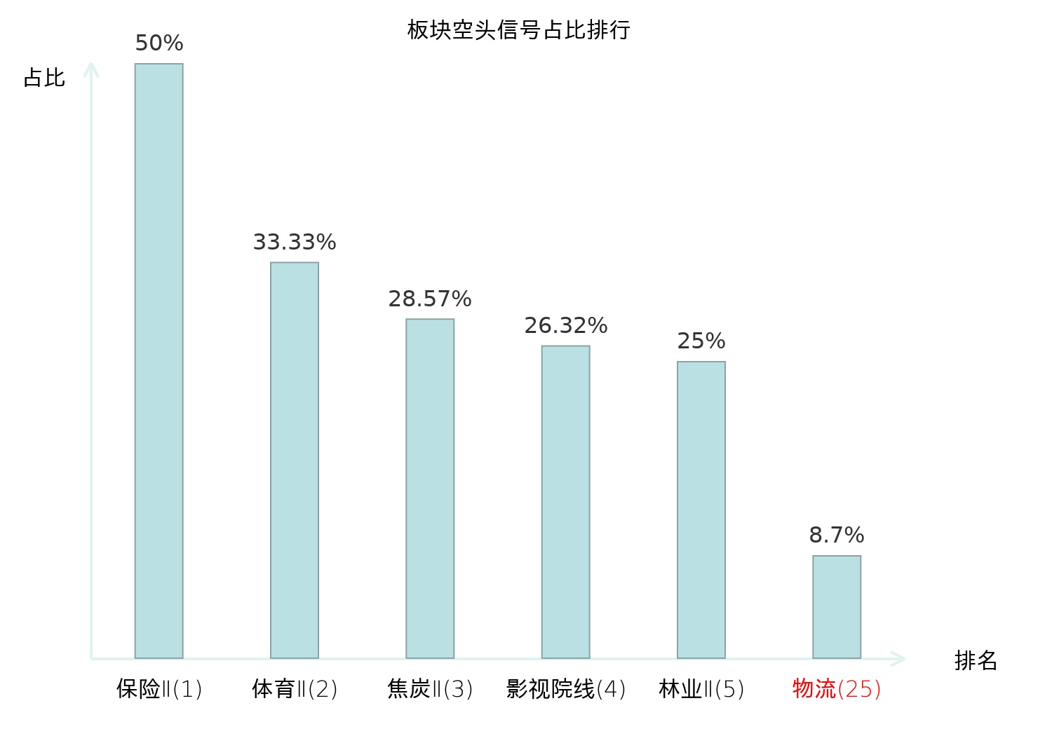 全市场所有行业板块中主力空头信号占比排名中,保险Ⅱ板块位居第一。装修建材板块名次提升最快,较昨日上升118位。