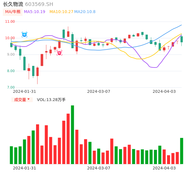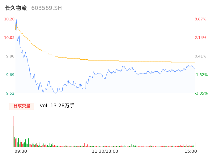 04月03日,长久物流收报9.75,股价涨幅-0.71%,成交金额1.30亿元,换手率2.20%。
