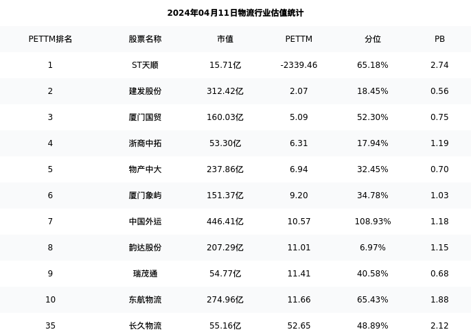 从估值角度看:长久物流最新市盈率PETTM为52.65,在行业内排名34/45,处于48.89分位。