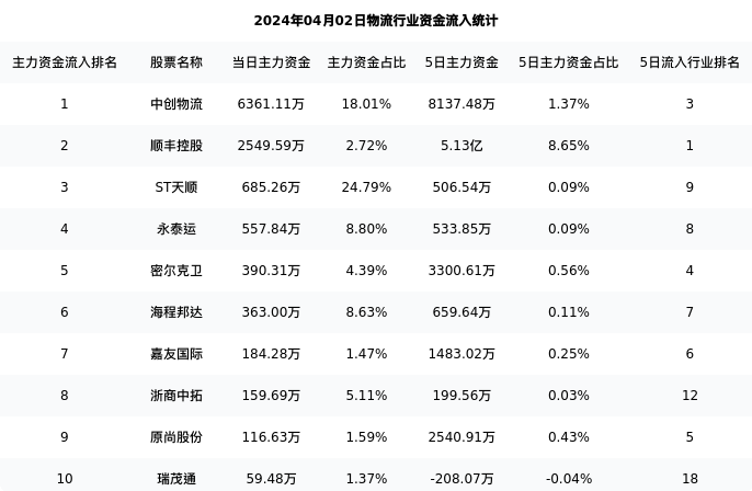 从主力资金流向来看,物流行业今日主力资金流入15.56亿元,在所有申万二级行业中排名:51/131。