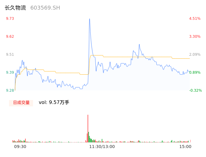 04月12日,长久物流收报9.40,股价涨幅0.97%,成交金额9066.73万元,换手率1.59%。