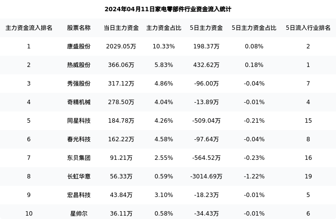 从主力资金流向来看,家电零部件行业今日主力资金流入5.18亿元,在所有申万二级行业中排名:6/131。