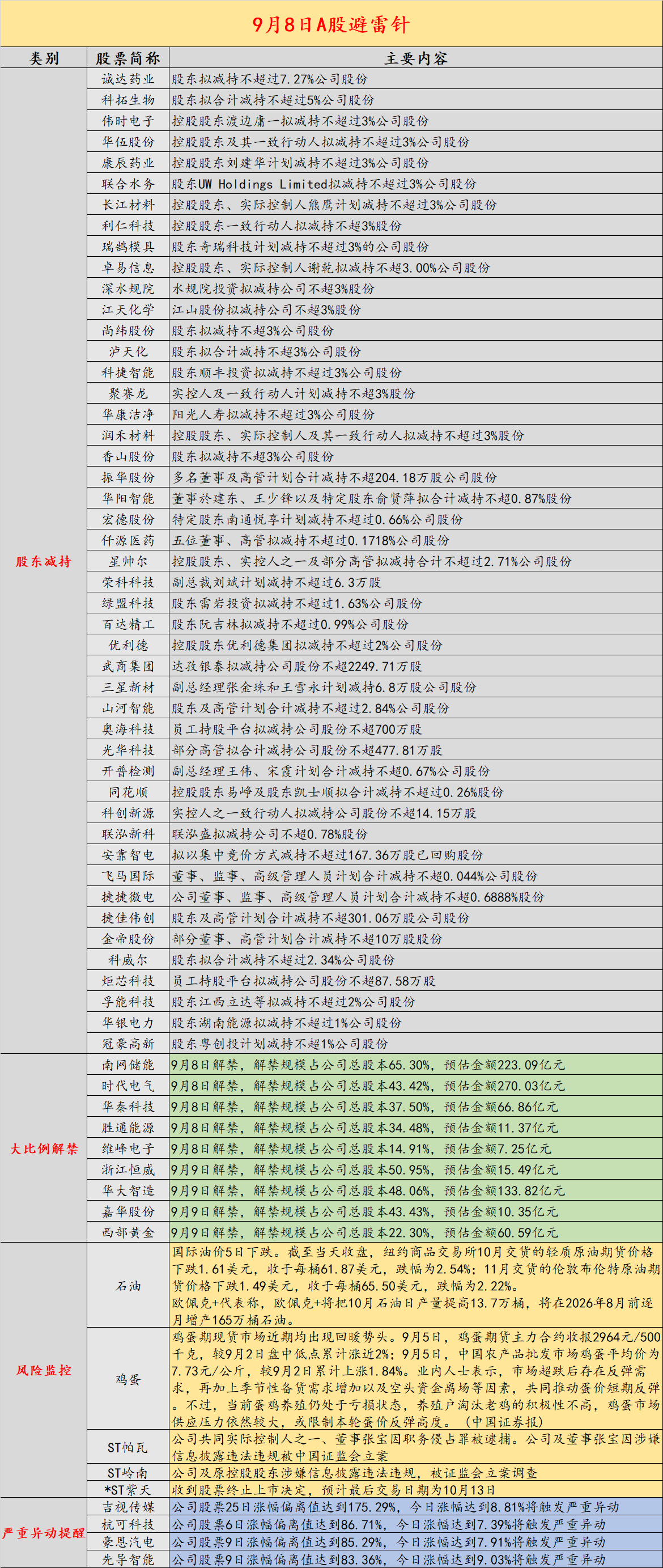 导读:财联社9月8日投资避雷针,近日,A股及海外市场潜在风险事件如下。国内经济信息方面包括:1)上周五国内商品期市夜盘收盘多数下跌,能源品领跌;2)供应压力仍存,蛋价短期反弹空间或有限;公司方面重点关注包括:1)诚达药业股东拟减持不超过7.27%公司股份;2)科拓生物股东拟合计减持不超过5%公司股份;海外市场重点关注包括:1)上周五美股三大指数集体收跌,英伟达收跌2.7%;2)美国8月非农就业人数增加2.2万,市场预估为增加7.5万。