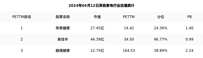从估值角度看:荣泰健康最新市盈率PETTM为14.42,在行业内排名1/3,处于24.36分位。