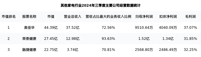 荣泰健康最新报告期数据为三季度,下表汇总了其他家电行业内市值靠前的公司三季度主要经营数据