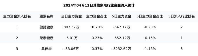 从主力资金流向来看,其他家电行业今日主力资金流入4118.97万元,在所有申万二级行业中排名:123/131。