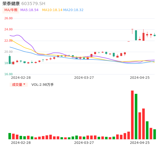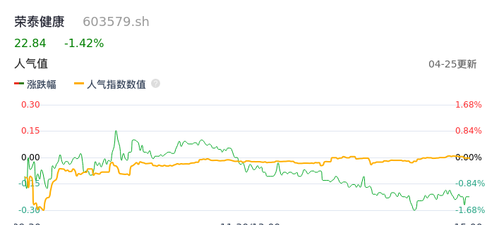 04月25日,荣泰健康收报22.84,股价涨幅-1.42%,成交金额6878.14万元,换手率2.15%。