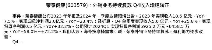 值得注意的是:2024年04月国投证券的分析师,首次发布关于荣泰健康的研究报告,标题为:荣泰健康(603579):外销业务持续复苏 Q4收入增速转正。