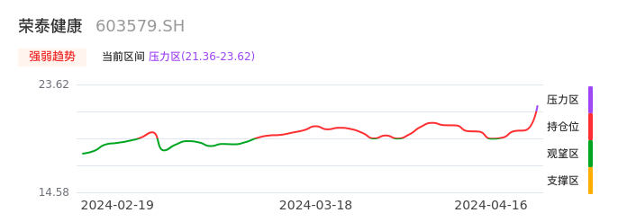 我们来看一下该股的九方特色指标强弱趋势的情况:荣泰健康近日从持仓区进入压力区。股价出现一波快速拉升行情,目前上升动能较为充足可继续持股。注意今日上方压力位:23.62元是否能有效突破。