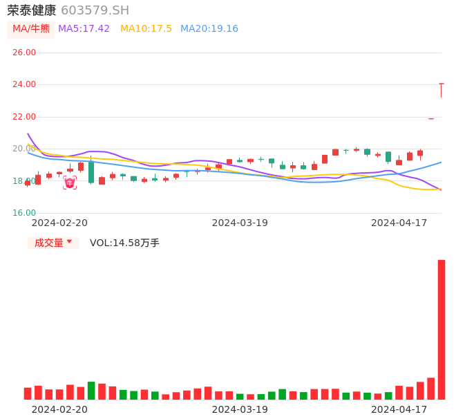04月17日,荣泰健康收报24.06,股价涨幅10.01%,成交金额3.50亿元,换手率10.49%。