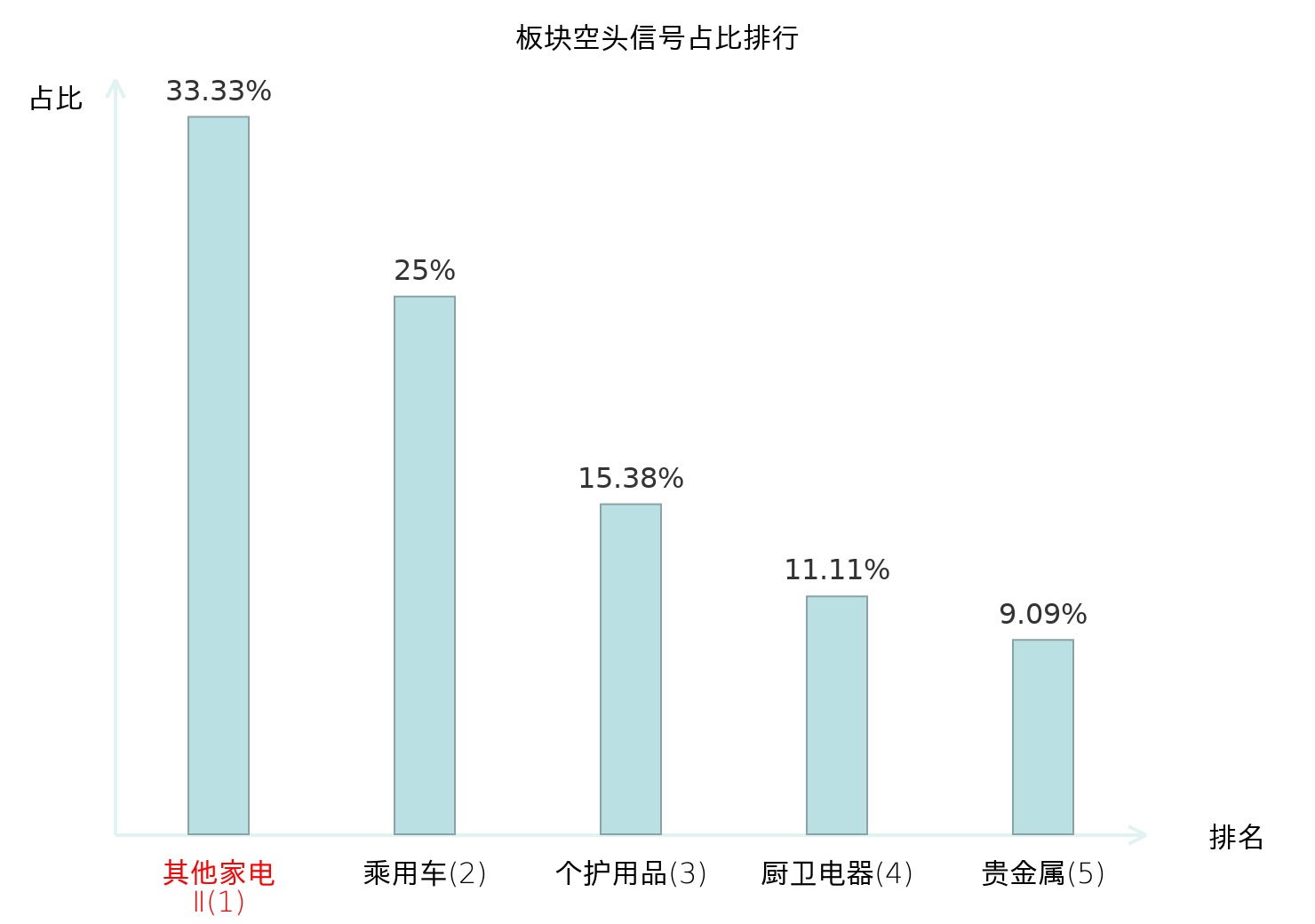 全市场所有行业板块中主力空头信号占比排名中,其他家电Ⅱ板块位居第一。个护用品板块名次提升最快,较昨日上升119位。