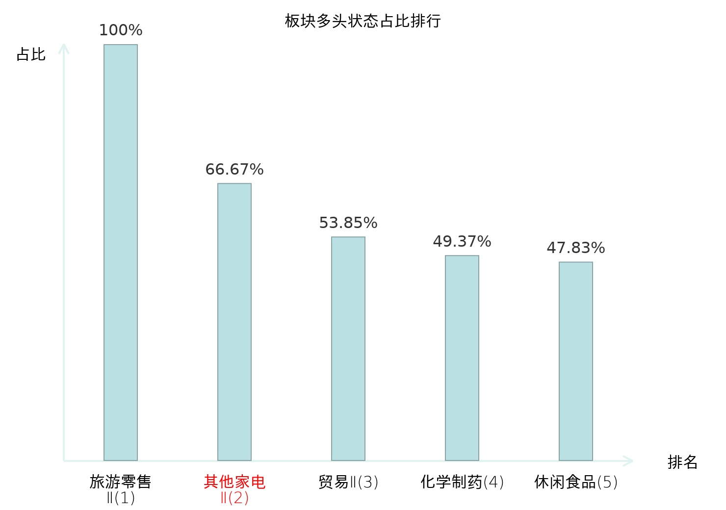 全市场所有行业板块中主力多头状态占比排名中,旅游零售Ⅱ板块位居第一。互联网电商板块名次提升最快,较昨日上升55位。