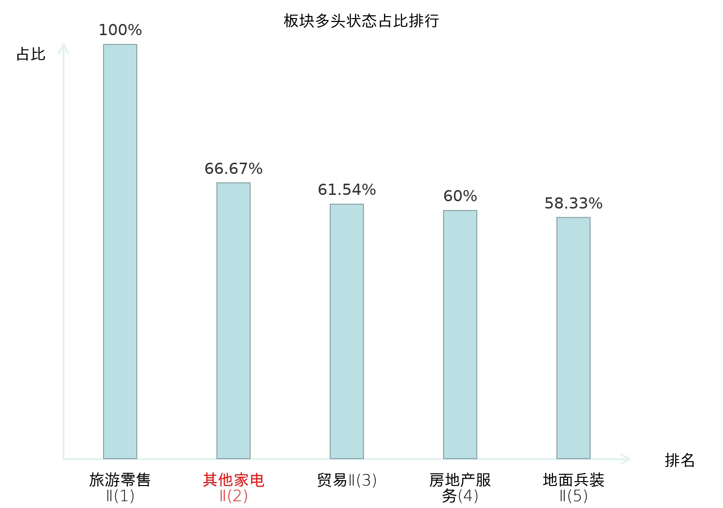 全市场所有行业板块中主力多头状态占比排名中,旅游零售Ⅱ板块位居第一。化妆品板块名次提升最快,较昨日上升62位。