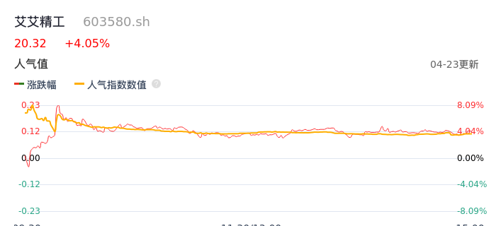 04月23日,艾艾精工收报20.32,股价涨幅4.05%,成交金额2.42亿元,换手率9.14%。