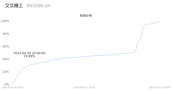 603580艾艾精工2024年04月30日成交16.28万手,成交金额3.55亿元,相较昨日放量6.87万手,换手率12.46%,成交活跃。