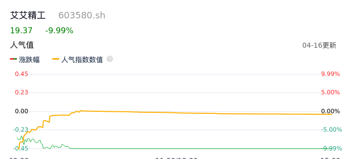 04月16日,艾艾精工收报19.37,股价涨幅-9.99%,成交金额1.74亿元,换手率6.75%。