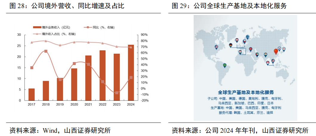 全球化产能布局也有利于公司应对关税政策变动风险,增强抗风险能力。此外,为了更好的服务全球客户,公司在美国、德国、新加坡、印度、日本、马来西亚、奥地利、匈牙利、巴西等地均设有子公司,并逐步构建了较为完善的全球运营中心架构。子公司可利用当地区位优势,保持对国内外市场下游需求良好的前瞻性、快速响应能力及持续开发能力,满足日益增长和变化的市场需求。目前公司产品和服务已得到100多个国家和地区数千名客户的认可。