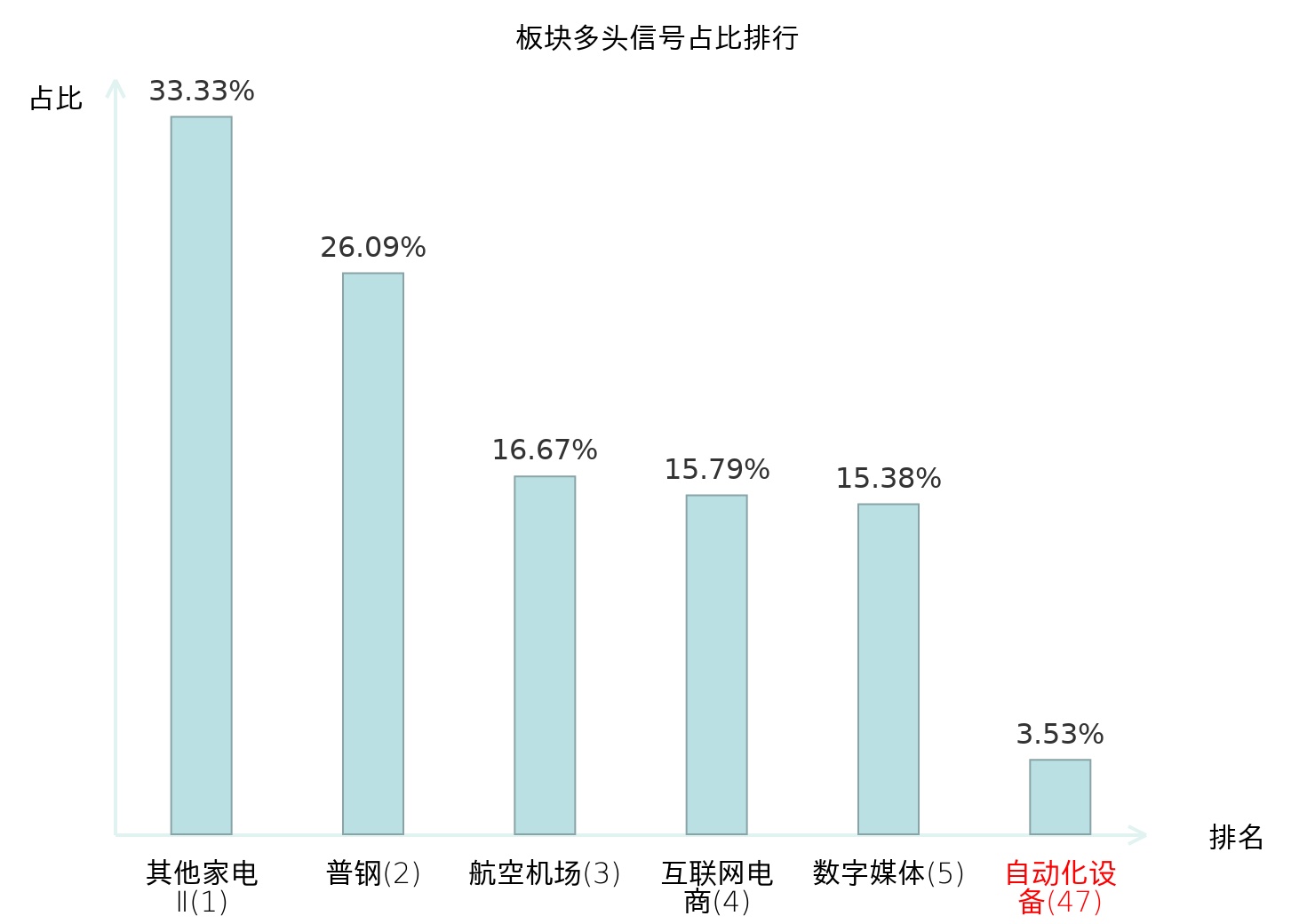 全市场所有行业板块中主力多头信号占比排名中,其他家电Ⅱ板块位居第一。其他家电Ⅱ板块名次提升最快,较昨日上升129位。