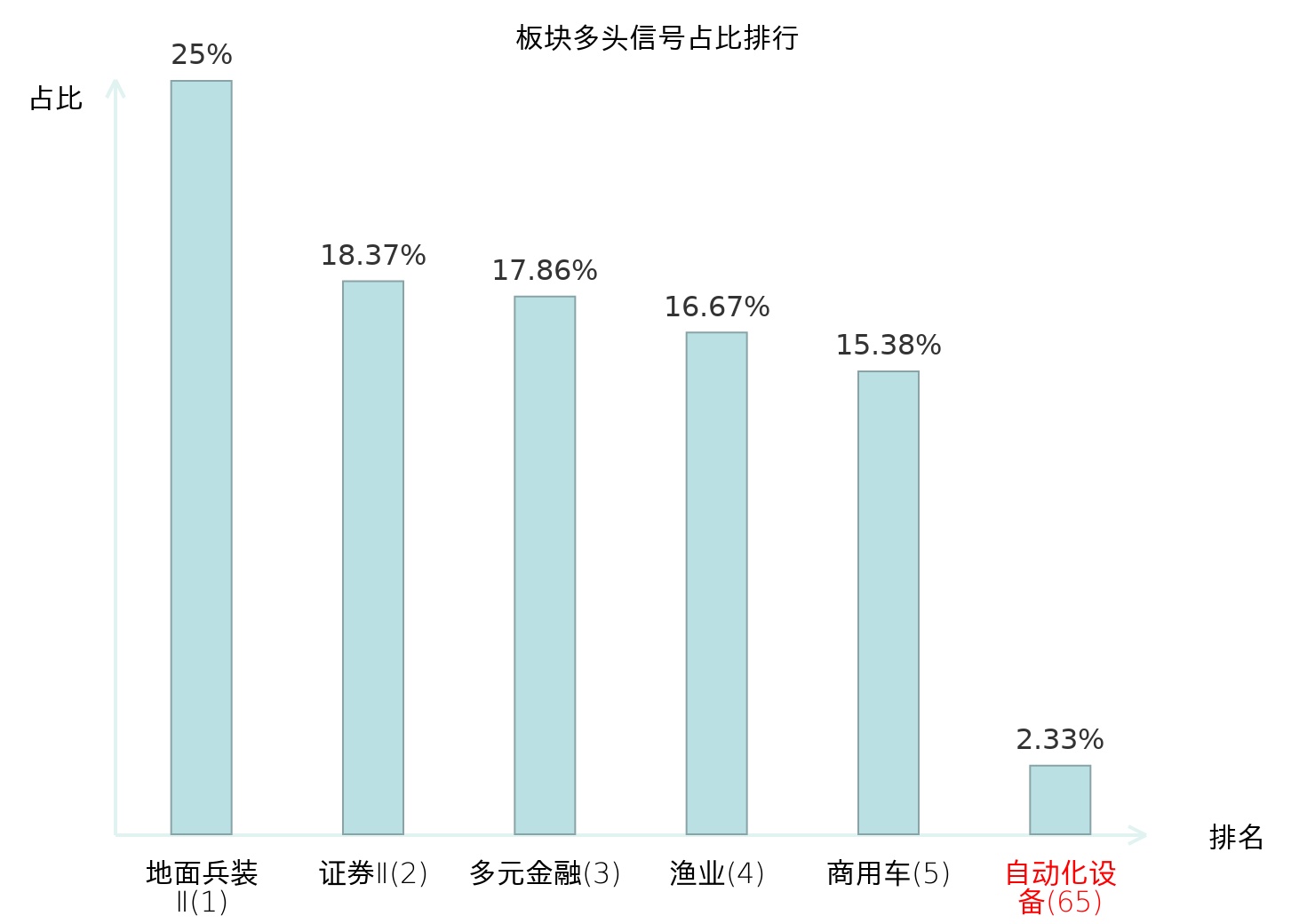 全市场所有行业板块中主力多头信号占比排名中,地面兵装Ⅱ板块位居第一。渔业板块名次提升最快,较昨日上升119位。